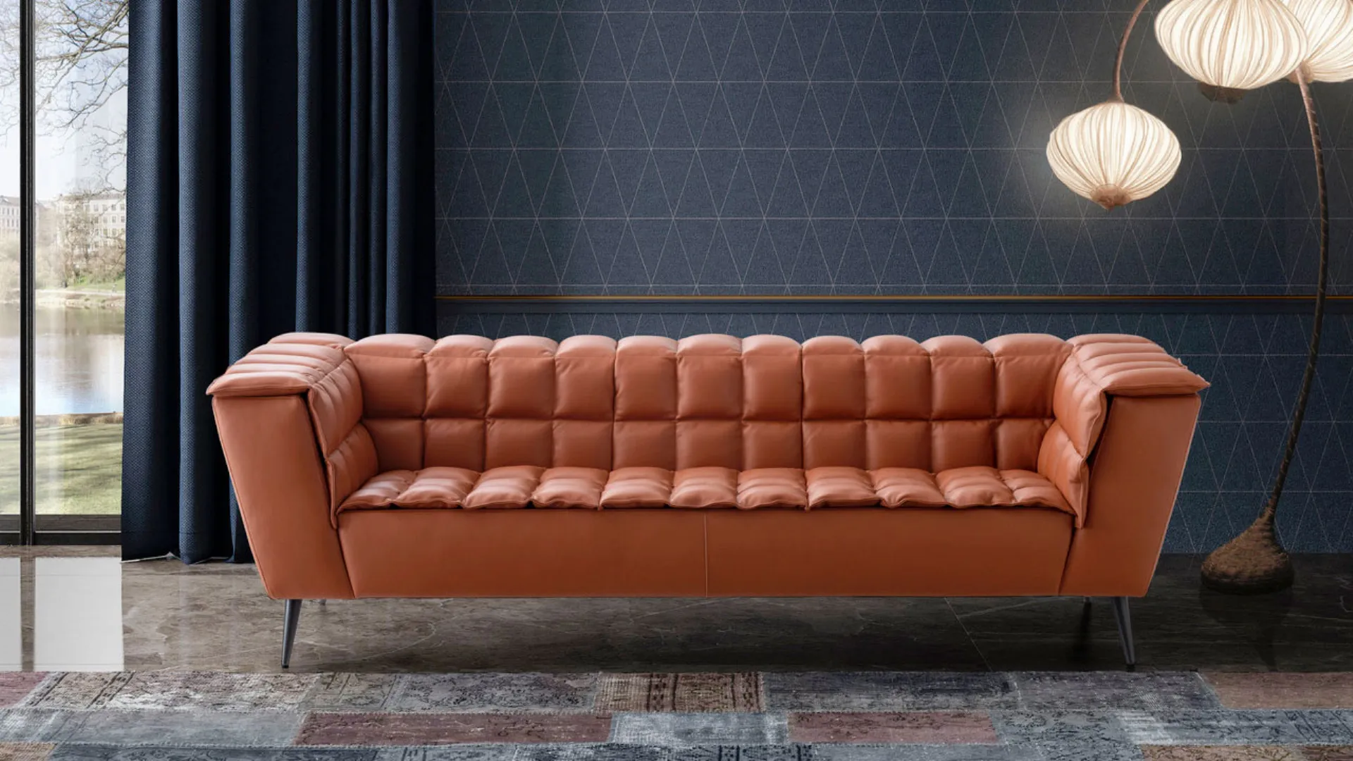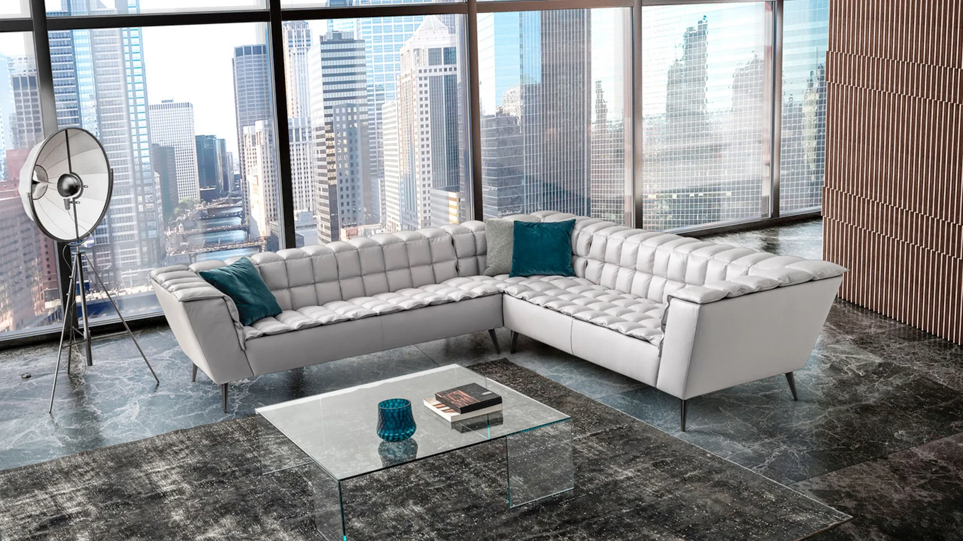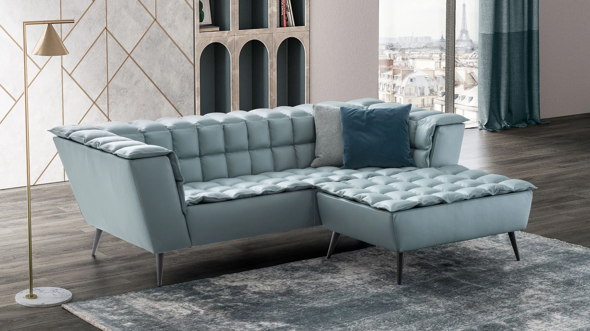 Struttura in abete e multistrato. Molleggio incrociato con cinghie elastiche rinforzate e rivestite. Imbottitura in poliuretano espanso indeformabile ad alta densità differenziata. Trapunta con cuscinetti indipendenti di poliuretano rivestiti in falda acrilica. Piedi in metallo verniciato antracite.
