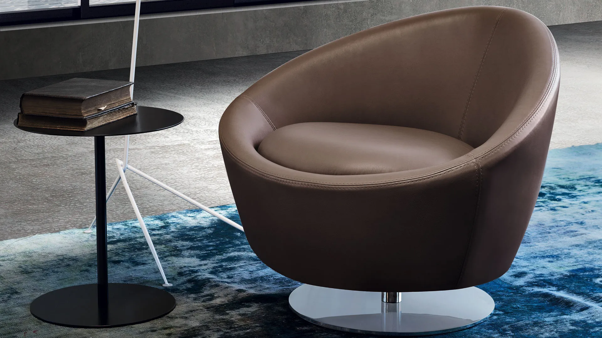 Imbottitura: poliuretano espanso indeformabile a densità differenziata ricoperto da falda acrilica. Struttura: intelaiatura in legno di varie essenze e molleggio con cinghie elastiche incrociate, interamente ricoperte e con anima in polipropilene. Rivestimento: pelle. Sfoderabilità: nessuna. Piedi: base girevole in metallo cromato.