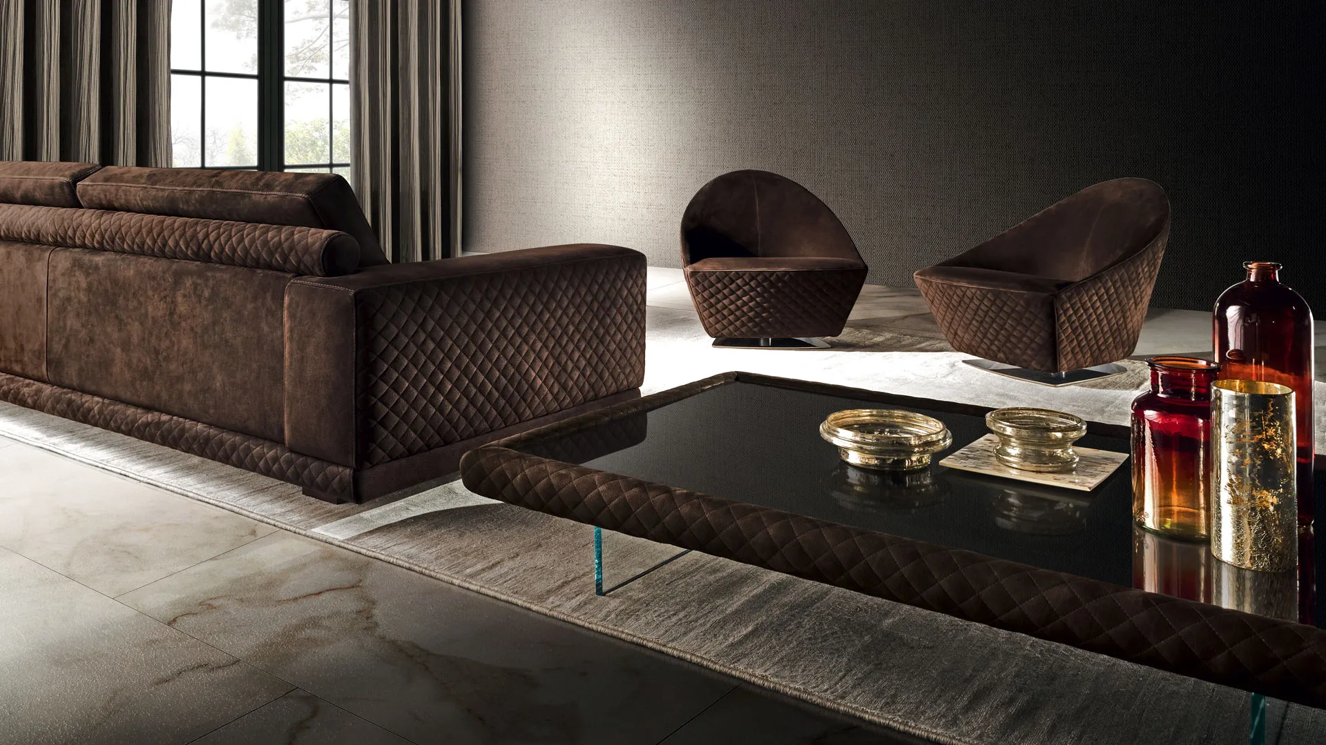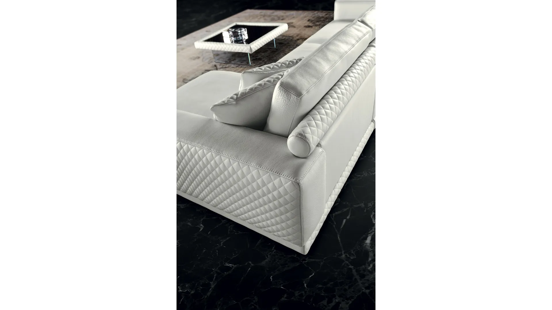Struttura in faggio, abete e multistrato. Molleggio incrociato con cinghia elastica rinforzata e rivestita. Cuscino seduta in poliuretano espanso indeformabile ad alta densità differenziata ricoperto da trapunta 100% in piuma canalizzata, cuscino schiena 100% piuma canalizzata. Fodere 100% cotone. Piede in legno massello verniciato. Cucitura “Chanel” su alcune parti di bracciolo, base e schiena. Cuscini seduta e schienale sfoderabili.