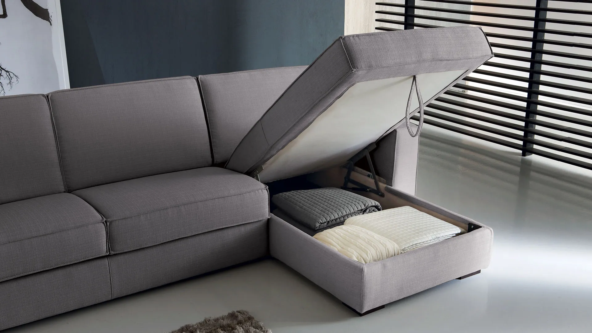 Sfoderabilità totale nella versione pelle e tessuto. Contenitore box dei guanciali nello schienale. Braccioli staccabili per facilitare il trasporto.