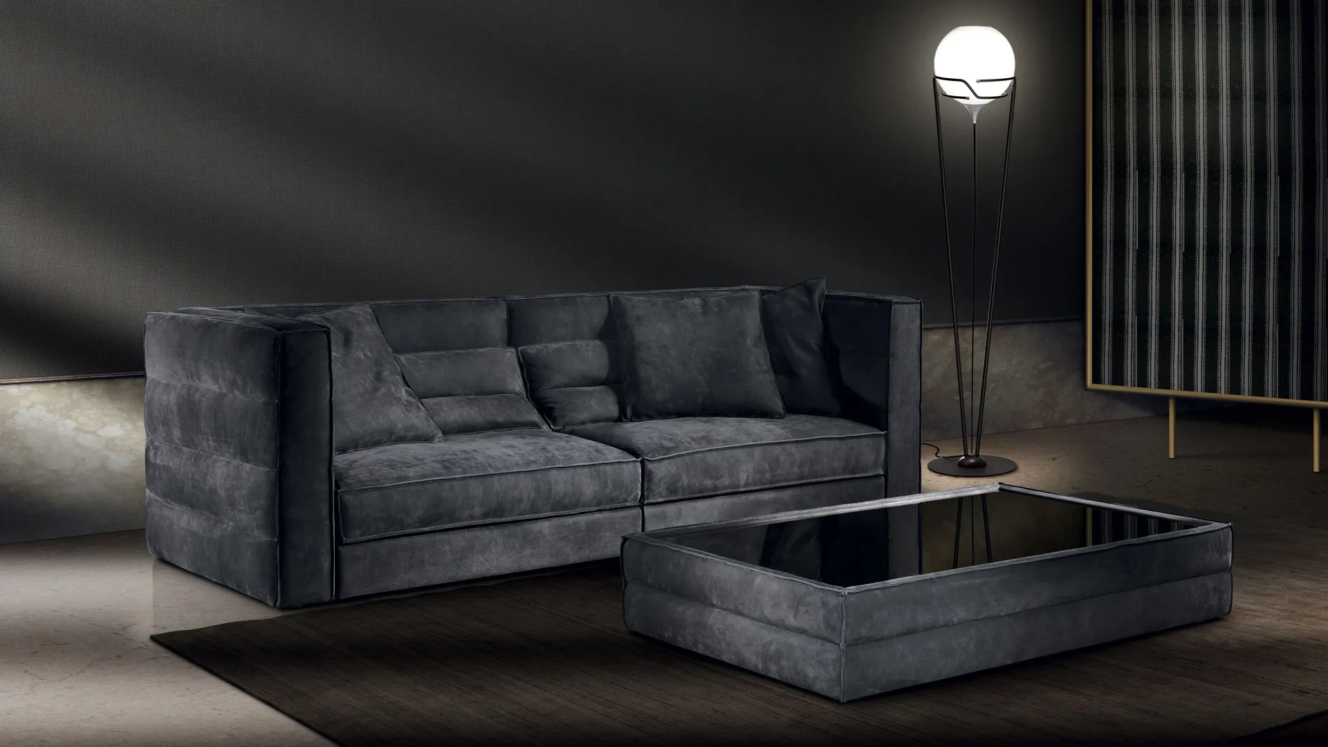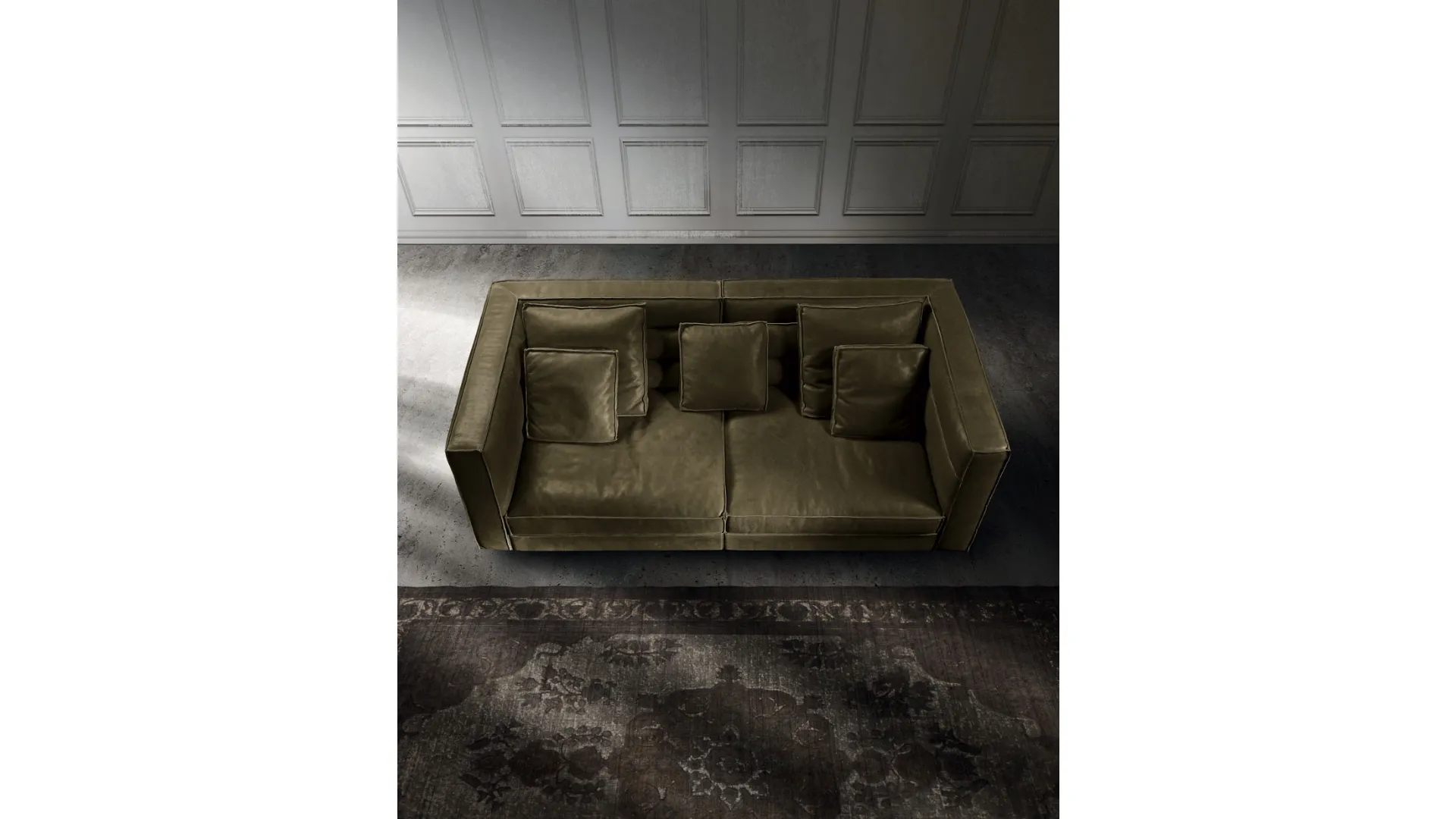 Struttura in legno e metallo, cinghie elastiche incrociate ad alta componente di caucciù. Imbottitura in poliuretano espanso a densità differenziata ricoperto da falda acrilica. Cuscini seduta in poliuretano espanso ad alta densità, rivestiti con fodera in piuma. Cuscini schienale 100% in piuma. Cucitura a “orlo vivo” (opzione doppia cucitura). Piedi in legno con antiscivolo.