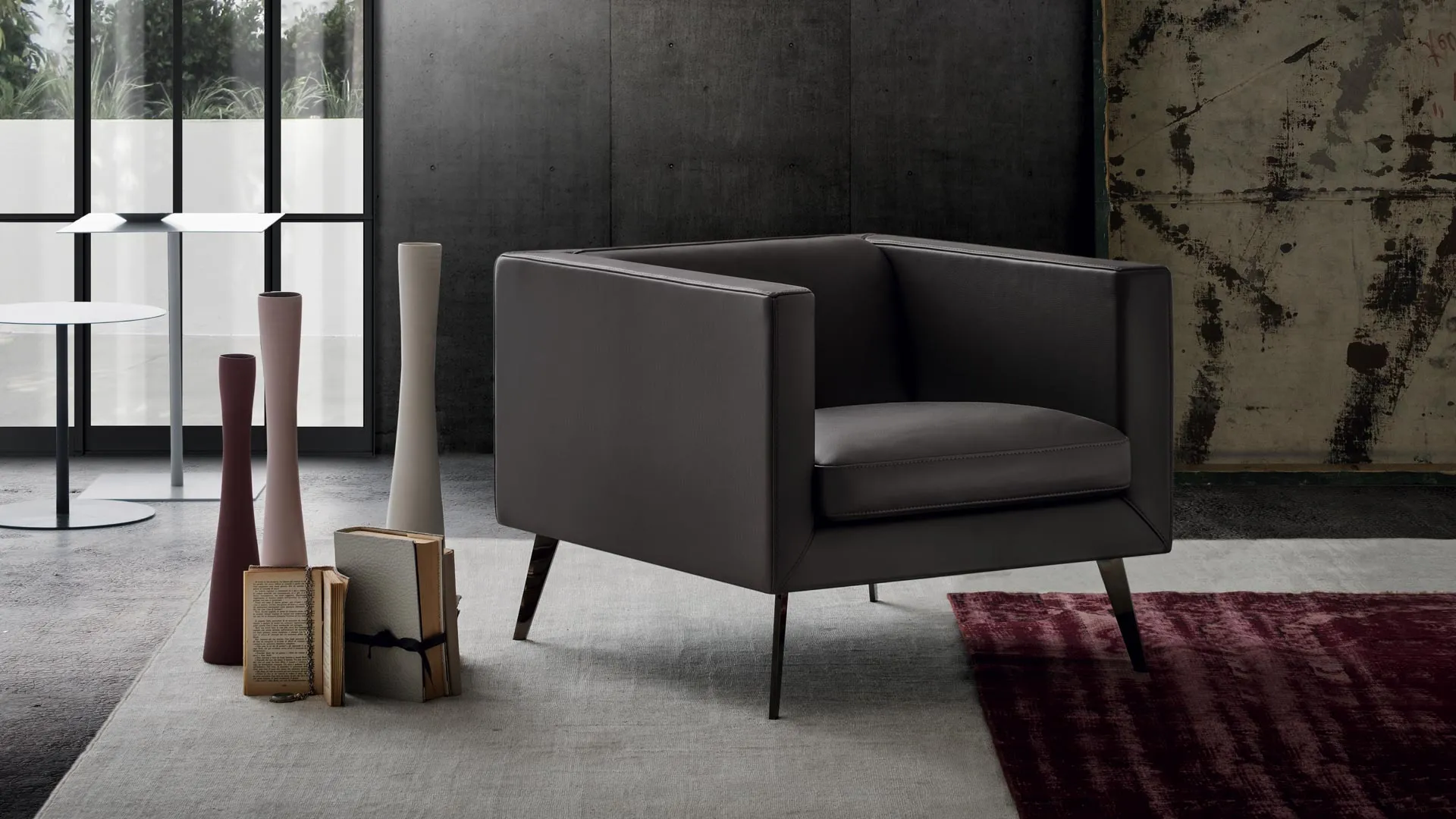 Accostamento tra rigore geometrico della seduta e la leggera eleganza del piedino cromato.