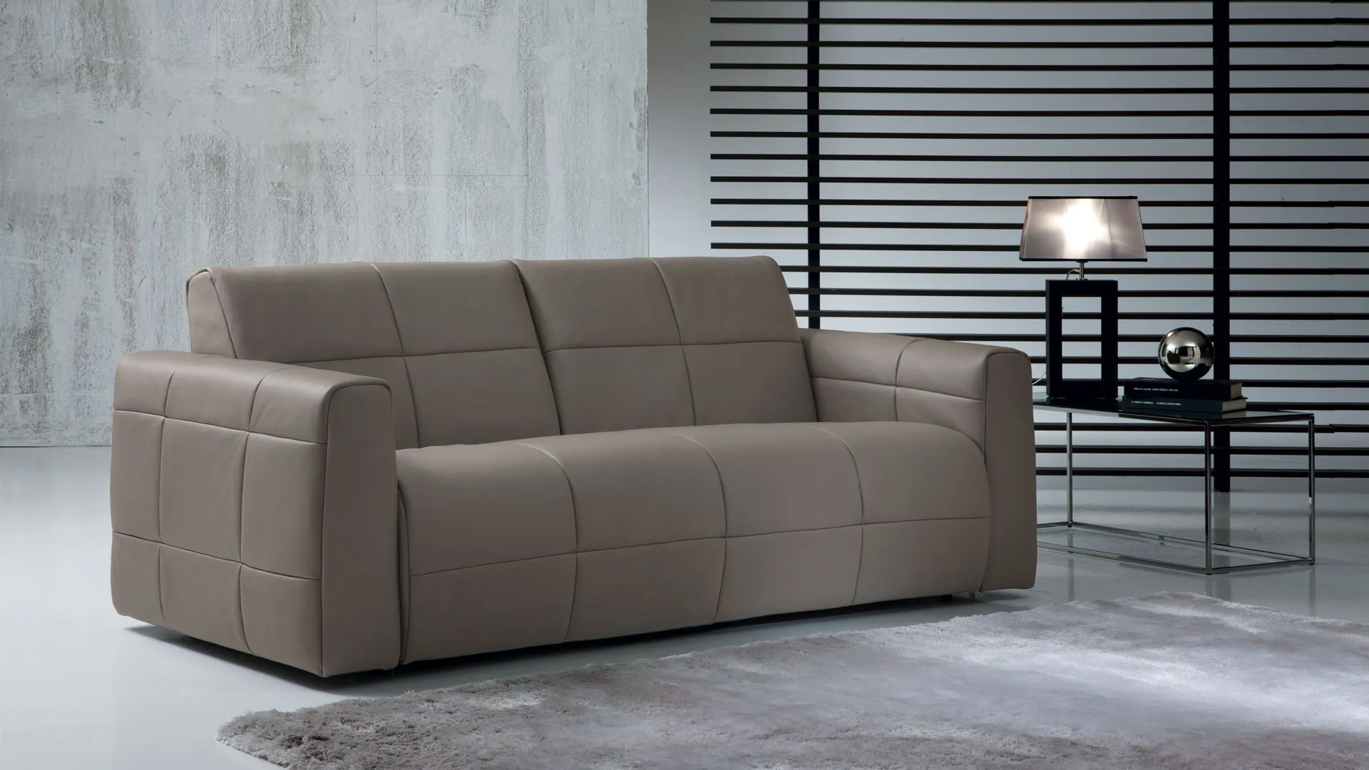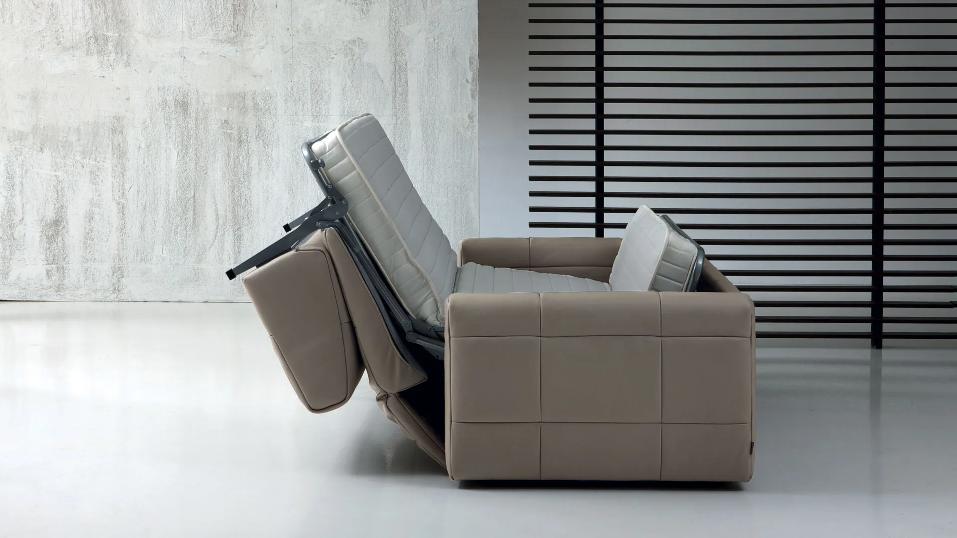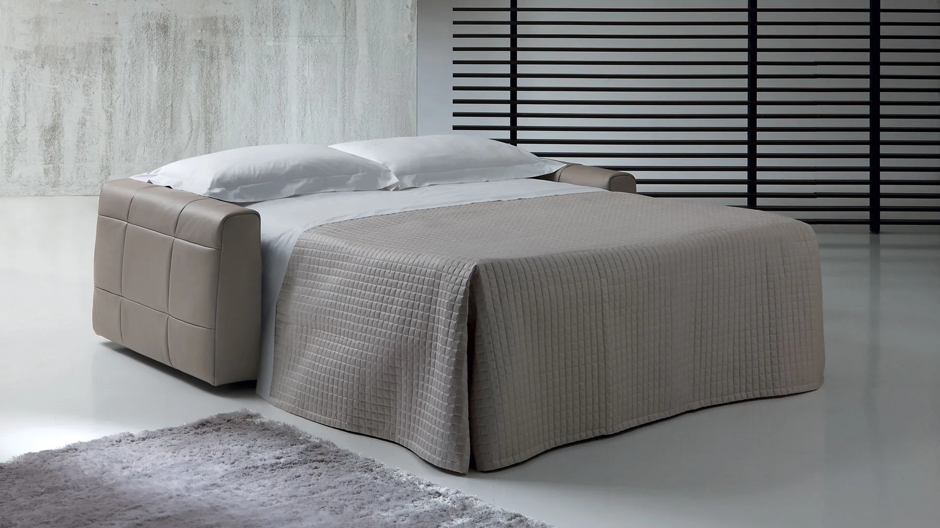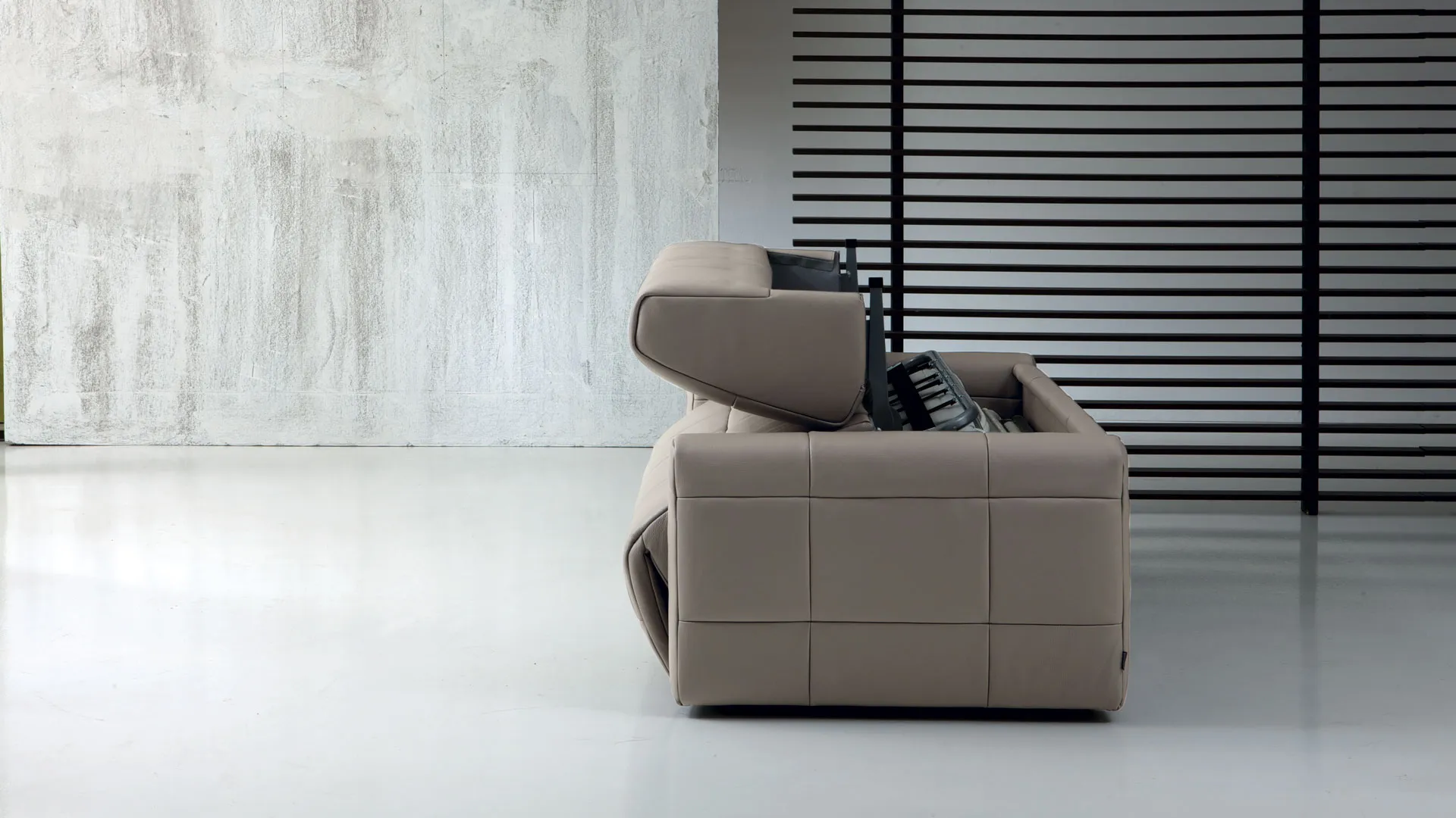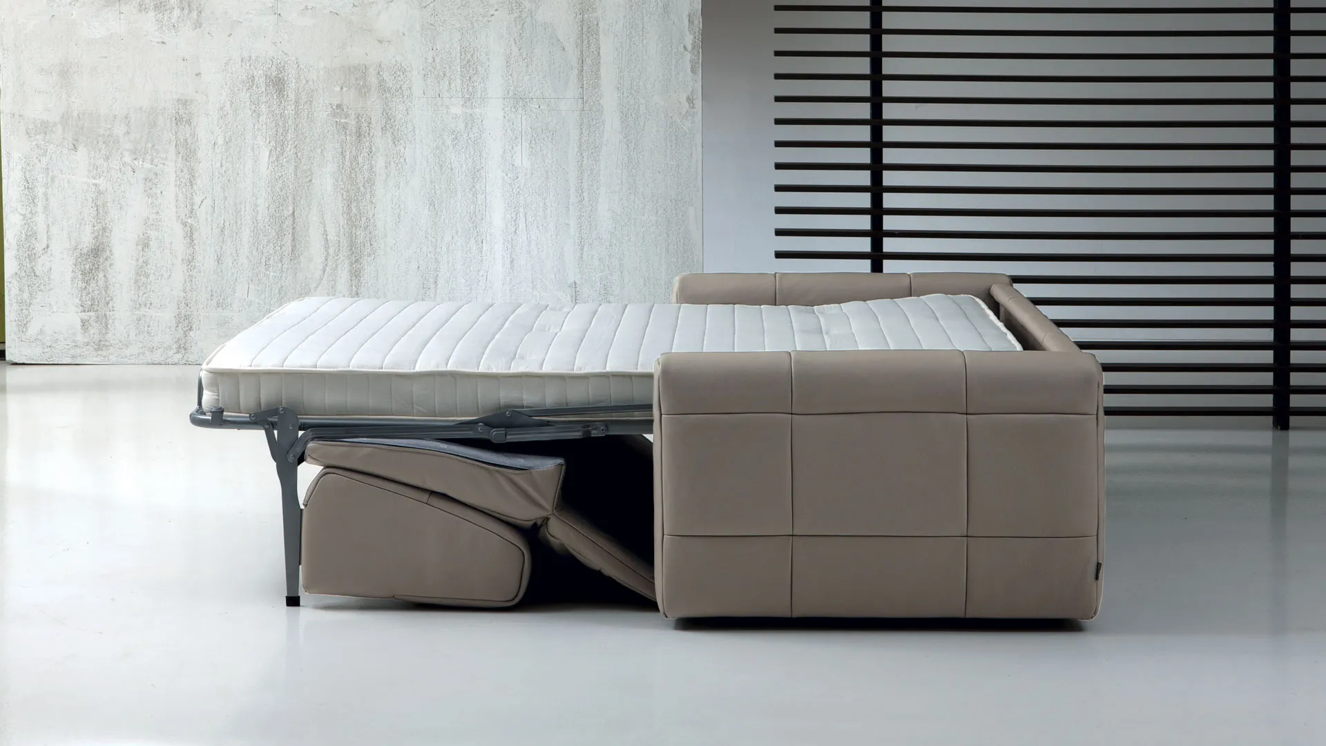 Imbottitura: Poliuretano espanso a densità differenziata rivestita in falda acrilica. Struttura: Legno. Meccanismo: Tubo ad alta resistenza verniciato a forno con polveri epossidiche eco-compatibili. Piano letto rete elettrosaldata. Seduta con cinghia elastica. Apertura e chiusura con un solo movimento. Materasso: A molle lunghezza cm. 195, spessore cm. 14. Opzione in poliuretano espanso. Piedi: Metallo cromato.