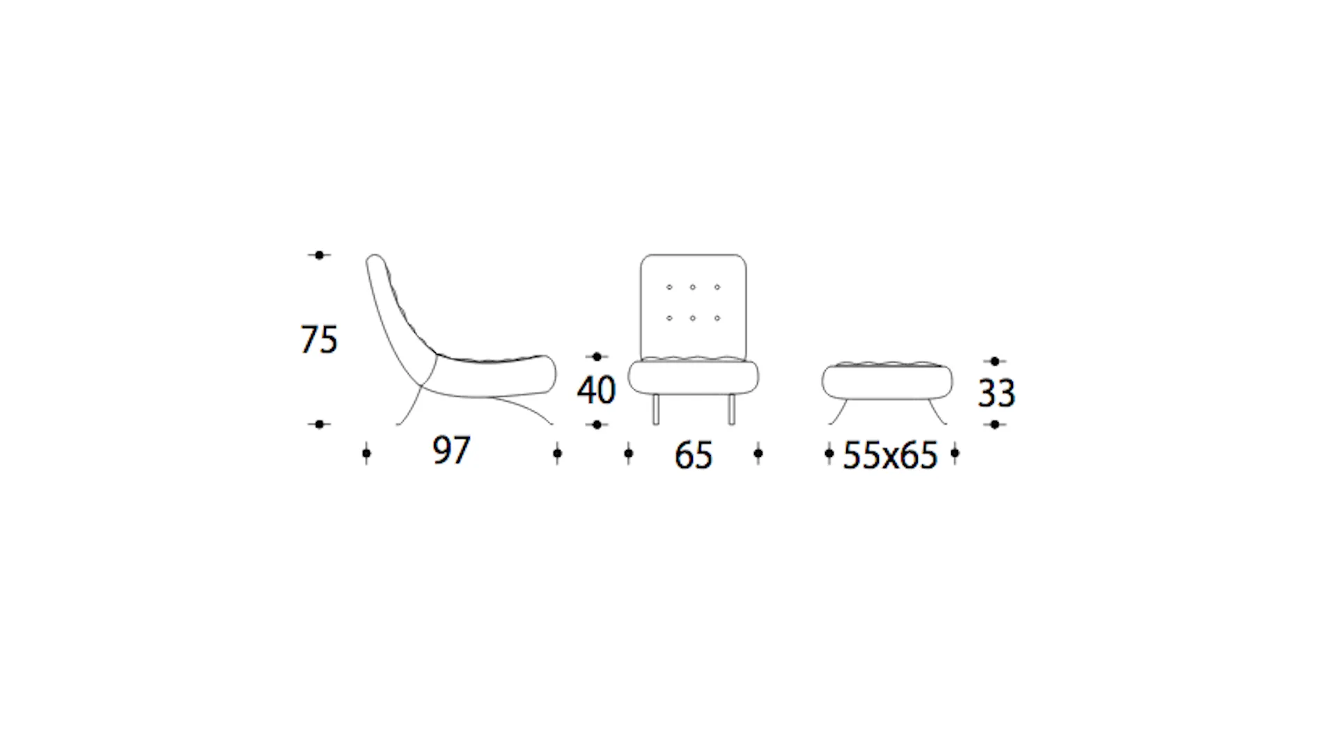 Struttura cromata che ne percorre il profilo, il capitonné di seduta e schiena, e il pouf che la completa.